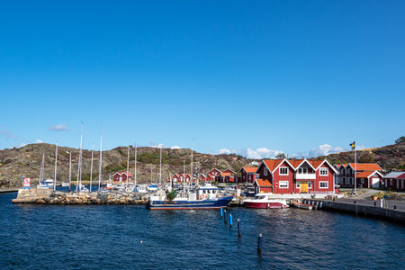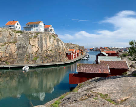 April 17, 2021 - Hamburgsund, Sweden: A picturesque fishing village on the Swedish West coast. Traditional red sea huts and a blue sky in the background