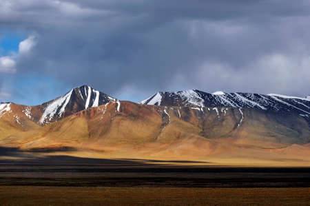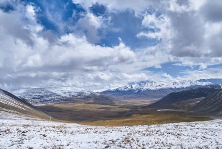 Winter landscape. Dramatic overcast sky.Severe mountains peaks covered by snow. Russia, Siberia, Altai mountains, Chuya ridge.