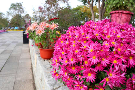 Delicate chrysanthemums bloom in late autumn. Late garden flowers in autumn.