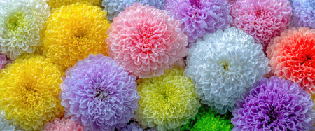 This image presents a collection of pom pom flowers in a variety of vivid colors. The composition highlights the texture and form of the blossoms. The overall style is bright and cheerful, suggesting potential uses for decorative design or background elements. It could be suitable for print or digital applications.