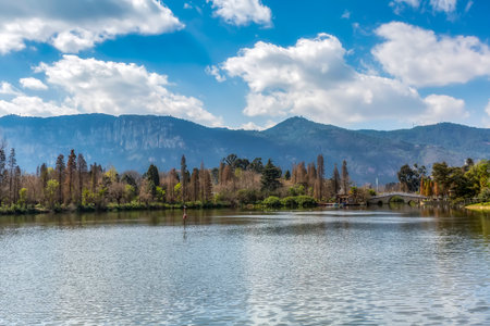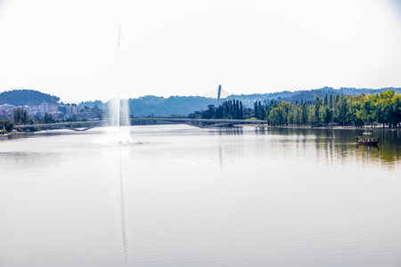 Reflection of the city on the water in the lake, natural landscape,Yunnn,China