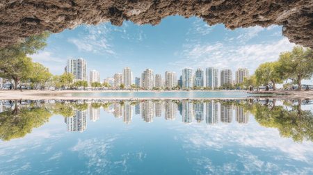 Skyscrapers stand tall along the shore with tranquil waters mirroring the striking skyline. Lush trees frame the view under a clear mid-afternoon sky.