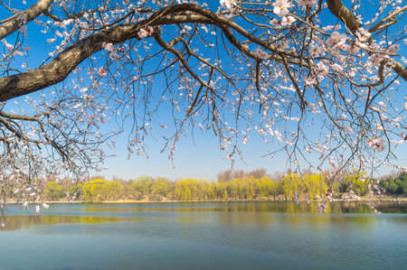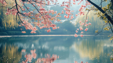 A serene scene of a lake surrounded by blossoming trees, with reflections of flowers on the water's surface