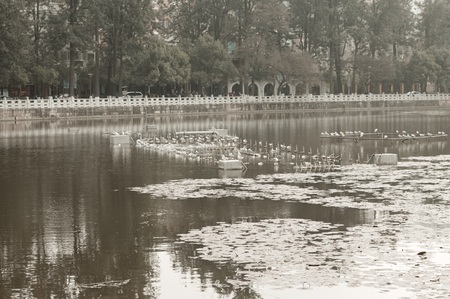 Pigeons on the Green Lake surface (Kunming, Yunnan, China)