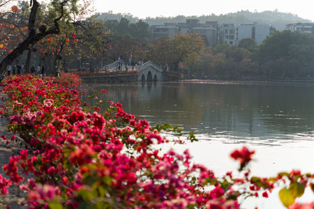 Red Bougainvillea Flowers in Foreground with Stone Bridge and Lake Behind