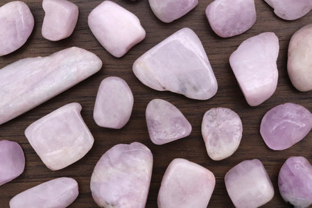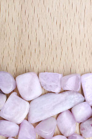Morganite rare jewel stones texture on wood background. Horizontal orientation.