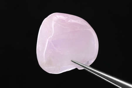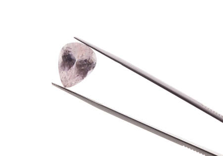Morganite jewel stone texture in tweezers on white background. Macro closeup. Horizontal orientation.
