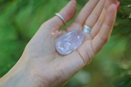 Female hand with transparent amethyst quartz yoni egg for vumfit, imbuilding or meditation. Shining crystal egg in hands on pine tree branches background outdoors. Womens health concept