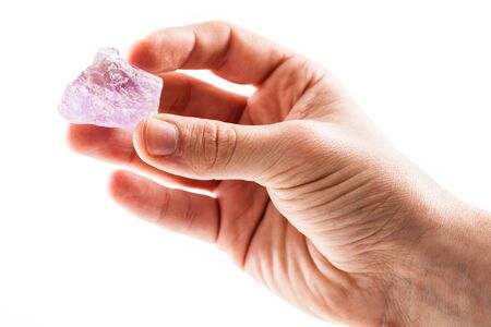 a male hand holding a fragment of amethyst mineral isolated on a white background