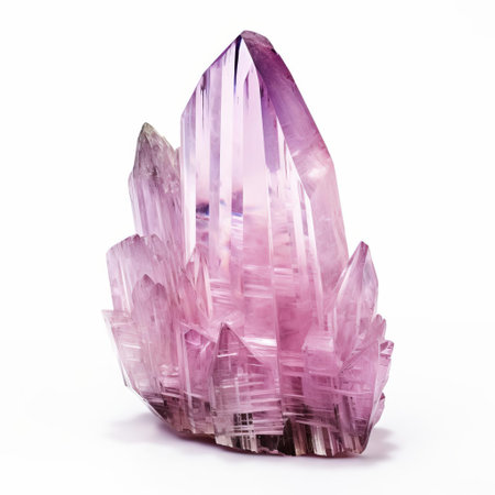 kunzite stone, a rare and precious gemstone, glimmers with a soft pinkish-lilac hue against a pristine white background, showcasing its unique crystal structure and subtle sparkle, perfect for jewelry enthusiasts and collectors of rare minerals. ai generated