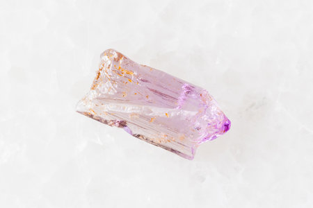 sample of rough kunzite mineral on white marble background close up from Afghanistan