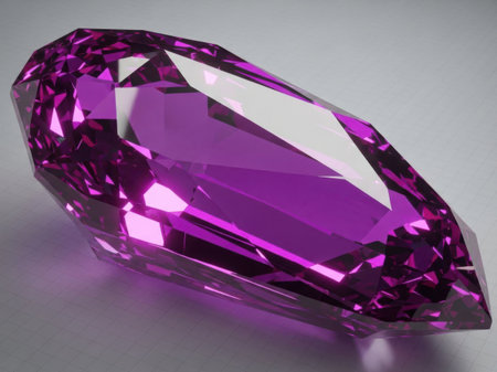 A close-up image of a radiant purple gemstone with a faceted surface, showcasing its vibrant color and intricate cuts.