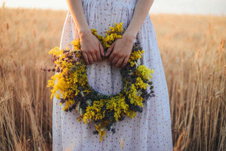 Wildflowers wreath on a sunny meadow. Sunny green natural background. Summer solstice concept.