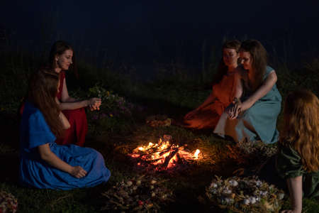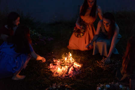 Lovely girls by the fire at night. Ancient pagan origin celebration concept. Night of Ivan Kupala.