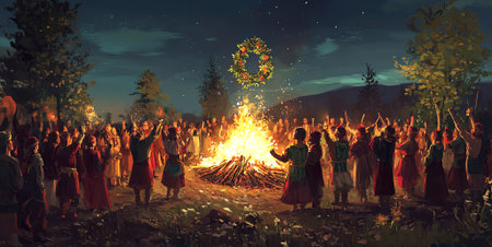 Summer Solstice Revelry: Wreathed Figures by Bonfire