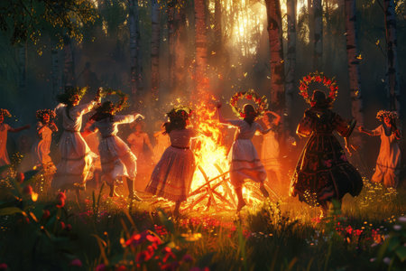 Ivan Kupala Celebration in Forest Clearing with Bonfire and Traditional Dances at Sunset AI