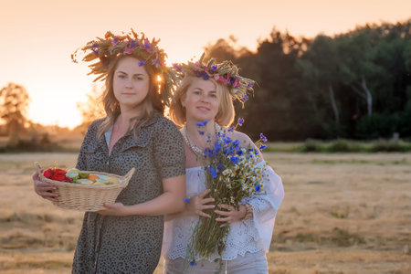 Two beautiful girls with wreaths on their heads, a fruit basket and wildflowers in their hands
