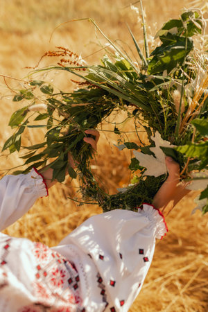 Close-up of Ukrainian girl in traditional blouse Vyshyvanka weaving a flower wreath for Ivana Kupala celebration. Folk costume, midsummer Slavic holiday, cultural tradition. Part of the series.