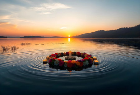 As the sun sets behind the distant hills, a circular arrangement of colorful flowers and candles gently ripples on the water's surface, creating a peaceful and harmonious atmosphere.