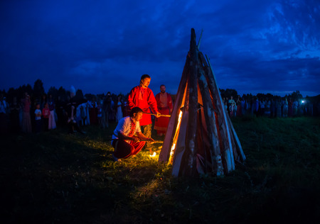 Midsummer. Young people in Slavic clothes revolve around a fire in the Midsummer