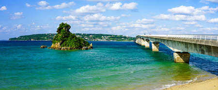 Scenic view of Kouri bridge and a small rocky island at the west side of northern Okinawa, Japan, -16