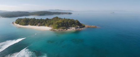 A tropical island in the middle of the ocean. Top view. Green palm trees and beach on the island. A place to relax. Subtropical isle with palm trees. Generative AI illustration