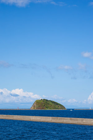 Beautiful seascape with blue sky and white clouds over the sea in Matsushima, Miyagi, Japan.