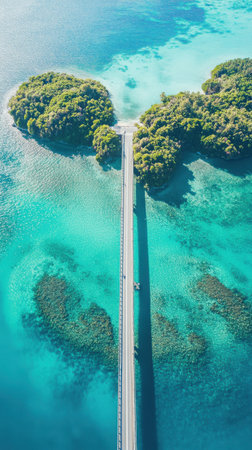 A breathtaking bridge spans across crystal-clear turquoise waters, linking two lush islands, showing nature's beauty and tranquility under bright daylight.