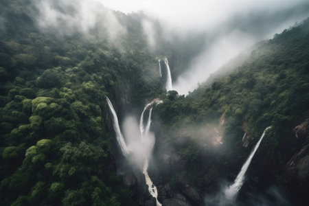 majestic waterfall with aerial view of its misty surroundings, created with generative ai