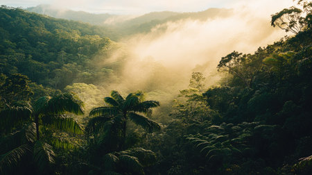 Experience the stunning beauty of a lush tropical forest, illuminated by gentle morning light and enveloped in soft mist, showcasing nature's charm.