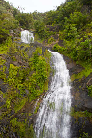 Kuranda, Queensland, Australia - December 4, 2009: Barron falls, tiered cascade of white water over brown rock cliff in the green wilderness.