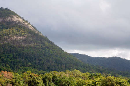 The Australian rainforest in the north of Australia near Cairns with green mountains and blue skies are white clouds