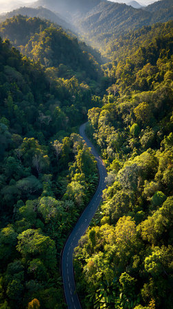Aerial view of a curving road cutting through dense green rainforest, illuminated by sunlight. A single car is visible traveling along the road, enveloped by mountains and trees.