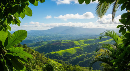 Discover the breathtaking beauty of a tropical forest featuring dense greenery and palm trees nestled within a serene mountain valley, creating a peaceful escape.