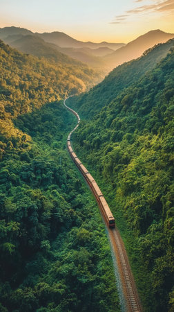 An aerial perspective of a train winding through vibrant green mountains, showcasing the beauty of nature and exploration. Ideal for travel and adventure themes.