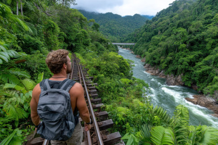 A hiker explores railway tracks beside a flowing river, surrounded by vibrant greenery and mountains.