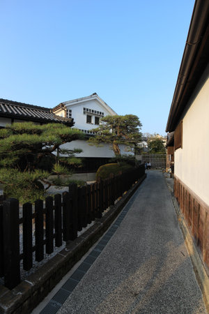 Kurashiki, Japan - April 28, 2014: View of Bikan historical area. It is the old merchant quarter and contains many examples of 17th century wooden warehouses painted white with traditional black tiles