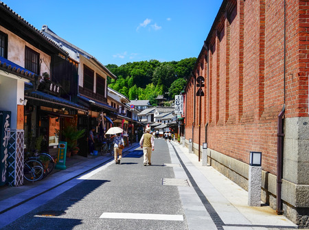 Okayama, Japan - Jun 14, 2015. Kurashiki Old Town with typical streets and traditional houses in Okayama, Japan. Kurashiki is a historic city located in western Okayama Prefecture.