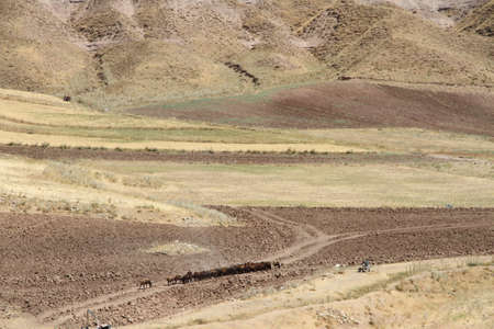 Central Asia. Kyrgyzstan. Freely grazing herds of sheeps and horses in the Eastern part of the Pamir tract on the border with Tajikistan.
