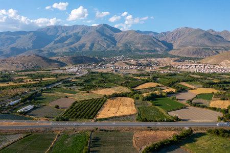 Aerial view of Kahta Sincik Road, close to Katha river near the village of Taslica, District of Kahta, Adiyaman Province, Turkey. Winding roads surrounded by nature with cars and vehicles. Nemtur Dagi road