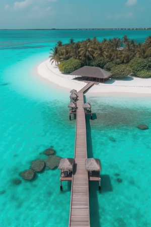 Generative AI : Aerial view of bungalows of a luxury hotel at sunset on Huluwalu Island Maldives archipelagos