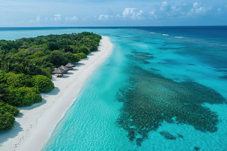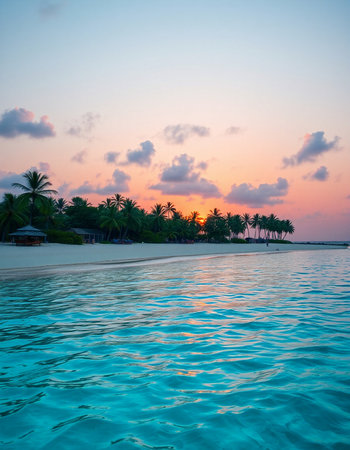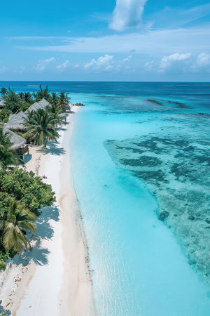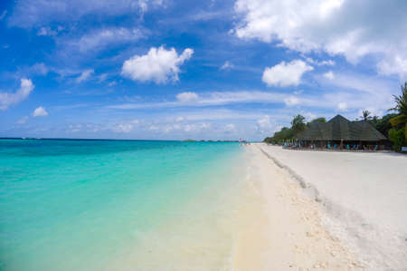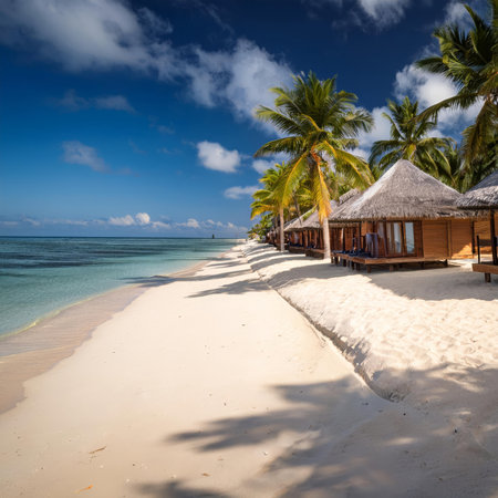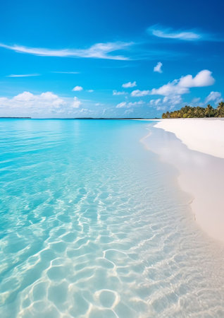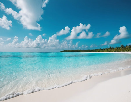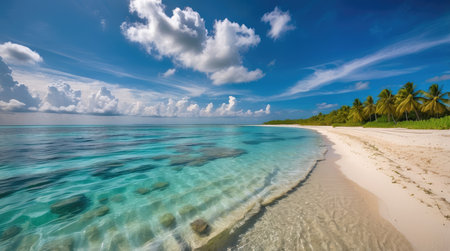 Breathtaking view of pristine white sand beach in Maldives. Turquoise waters of Indian Ocean lap gently at shore, creating serene idyllic scene. Sky is vibrant blue, dotted with fluffy white clouds