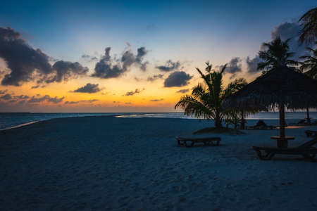 Beautiful sunset on the tropical beach. Maldives, Indian Ocean.
