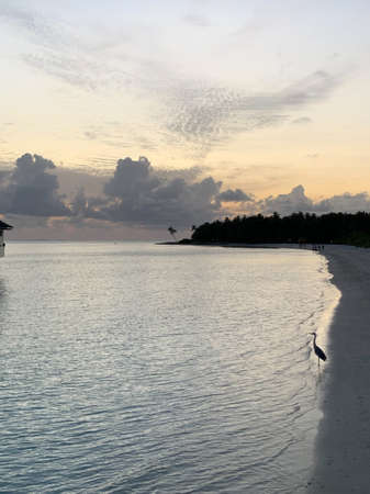 Sunset in the Maldives, a bird that looks like a heron stands on the white sand on the shores of the Indian Ocean against a blue sky with clouds.