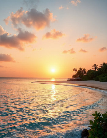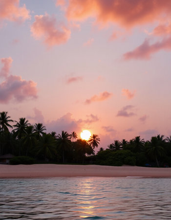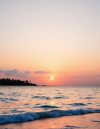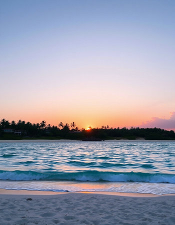 Soft waves lap against the shore as a pastel sunset paints the sky. Lush greenery lines the beach, creating a secluded, peaceful atmosphere in this coastal paradise.