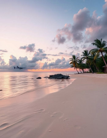 Experience the tranquility of a serene tropical beach surrounded by lush palm trees and vibrant blue skies, perfect for relaxation and escape.