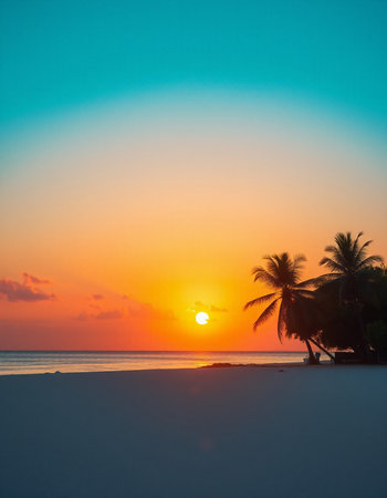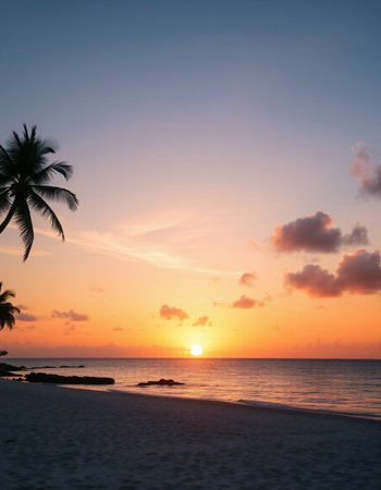 Tropical beach at sunset with coconut palm trees silhouettes.
