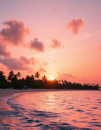 Beautiful sunset on the beach at Maldives, Indian Ocean.