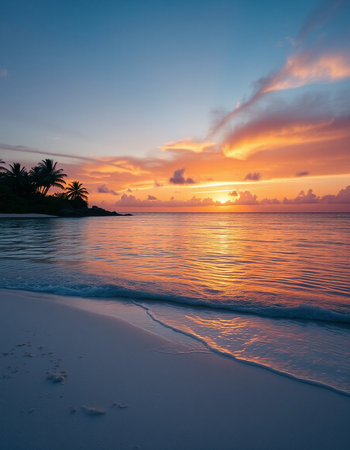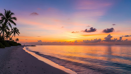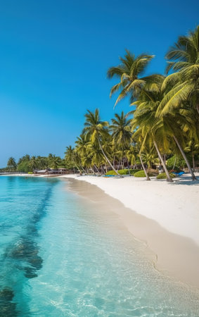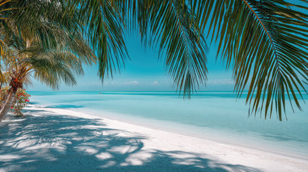 A tranquil tropical beach scene featuring fine white sand, crystal clear water, and palm trees swaying gently under a vibrant blue sky. Perfect for vacation.