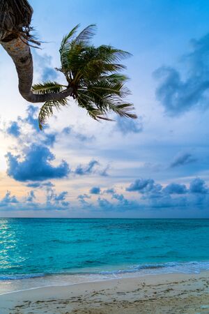 Beautiful sunset on the beach with coconut palm tree. Maldives